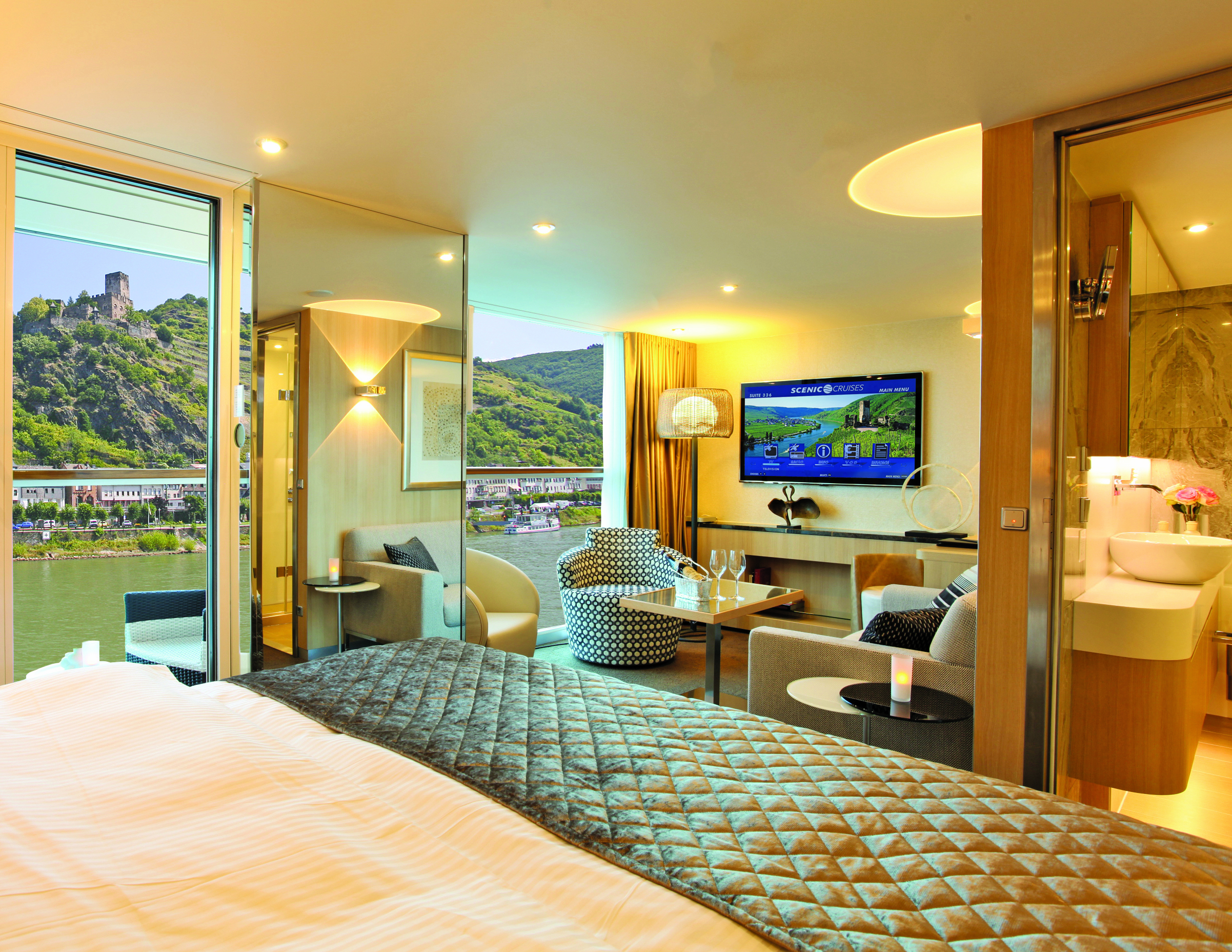 129 square foot suite with spacious bathroom with shower, flat screen TV and infotainment system and spacious outdoor balcony featuring Scenic ‘Sun Lounge’.